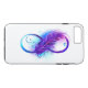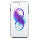 Infinity symbole with a beautiful feather painted in purple and blue bright colors on white background