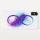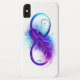Infinity symbole with a beautiful feather painted in purple and blue bright colors on white background