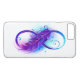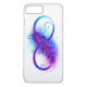 Infinity symbole with a beautiful feather painted in purple and blue bright colors on white background