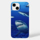 iPhone 14 coque est montré avec une photo de requins. Customiser ou acheter tel quel.