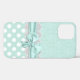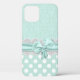 Joli étui vert menthe et blanc pour iPhone 12, avec un motif damassé vert menthe sur vert menthe en haut, et un motif à pois vert menthe et blanc en bas. Des graphiques d'une bande de dentelle blanche et d'un ruban vert menthe avec un nœud traversent le milieu entre les deux arrière-plans. Personnalisez pour ajouter votre propre texte. Un excellent moyen de paraître élégant et de protéger votre appareil électronique en même temps.
