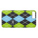 Jacquard motif noir, vert, bleu monogramme personnalisé féminin iPhone 7 plus coque. Formes de diamant en noir, vert citron et bleu ciel, lignes diagonales croisées blanches et un diamant avec vos initiales.