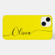 Jaune Noir Élégant Script de calligraphie personnalisée Nom personnalisé iPhone 14 Smart Phone Boîtes dispose d'un design moderne et tendance simple et élégant avec votre nom personnalisé dans élégante calligraphie manuscrite typographie de script sur un arrière - plan jaune. Conçu par ©Evco Studio www.zazzle.com/store/evcostudio