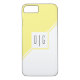 Coque géométrique Jaune et blanc iPhone 8/7 avec monogramme. L'avant comprend deux bandes diagonales, une jaune et une blanche, qui séparent la carte en deux triangles. Un carré blanc est au centre avec votre monogramme.