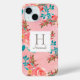 Un joli monogramme iPhone 15 coque avec un élégant modèle rose, aqua et corail aquarelle motif floral et l'initiale et le nom de votre choix.