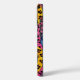 Cette image vibrante est un gros plan d'un tableau représentant un motif ondulé et tourbillonnant d'empreinte de léopard dans différentes couleurs. Les couleurs sont le bleu, le rose, le turquoise, le violet, le jaune et l'orange, le tout avec des taches noires. Les coups de pinceau sont épais et superposés, donnant l'impression d'une texture dynamique et mouvante.
