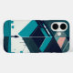 Cette oeuvre abstraite minimaliste et contemporaine présente des formes géométriques bleues aux accents orange clair et une silhouette d'homme