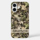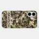 Customize this leaves camouflage iPhone 16 case with your name in a trendy modern CAP font in brown on opaque cream. It's masculine and perfect for your favorite military, hunting, country or outdoorsman!