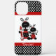 Le coque iphone de l'enseignant élégant, fait en blanc, avec des pois noirs et blancs, en haut et en bas et bordé d'une bande rouge. Des graphiques mignons d'un gros et un petit coccinelle, avec un tenant une crayon. Texte en blanc, dit Enseignant. Personnalisez le texte pour lire ce que vous voulez.