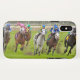 Un plein champ de neuf chevaux tournant pour la maison au dessus de l'étendue sur le gazon à l'emballage et au casino de Parx. Emballage du plus grand moment où les pur sangs se transforment en étendue pour la commande finale vers la ligne d'arrivée. Menant la manière, le gris blanc "rapidement et les avances précises la charge avec le JR de Jose Ortiz de jockey dans les fers. Herbe verte, cieux bleus et pur sangs blancs chez Parx historique pour le fonctionnement des enjeux de soupe à alphabet.
