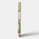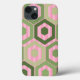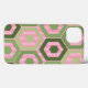 Ce boîtier téléphonique a un design géométrique d'hexagones dans quatre tons de vert sur un champ de rayures roses dans deux tons.