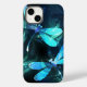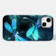 Deux libellules transparentes, lumineuses, turquoise, artistiquement dessinées sur l'arrière - plan de nuit avec des algues luminescentes et des lucioles. libellule éclatante.