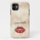 Cette étui de téléphone glamour et girly personnalisée dispose d'un arrière - plan de feuille d'or champagne. Une image des lèvres de parties scintillant rouge vif est placée au centre. Un exemple de nom est imprimé au-dessus des lèvres dans une police de script élégante. Vous pouvez personnaliser l'étui téléphonique et ajouter votre propre nom ou texte personnalisé.