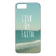 Live by Faith Bible Verse coque iphone. Aqua plage arrière - plan océan avec filtre rétro avec l'écriture inspirante de 2 Corinthians.