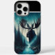 Un orignal majestueux se dresse sur fond de ciel étoilé, avec ses bois qui s'élèvent vers les cieux. Le sol de la forêt est une étendue sombre, avec une rivière qui coule à travers la scène.