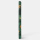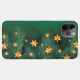 Un étui téléphonique vert avec thème de Noël, avec des branches de pin et des étoiles dorées, avec de petites lumières.
