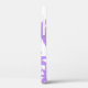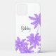 Protégez votre smartphone avec une jolie casserole violette personnalisée sur une étagère de téléphone portable blanc. Customisez ce mignon coque de dispositif botanique avec votre nom ou votre texte. Cette couverture fleurie personnalisée présente des marguerites violettes vives ornant le coin d'un arrière - plan blanc.