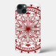 Ce boîtier téléphonique a un design mandala simple fait de lignes, de courbes et de formes en rouge profond sur un champ de blanc.