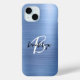 Cet élégant étui de téléphone personnalisé présente un monogramme et un prénom en écriture moderne noir et blanc sur un arrière - plan en métal brossé bleu tendance.