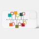 Ce boîtier de téléphone a un design moderne du milieu du siècle qui ressemble à un mobile avec des carrés solides et ouverts suspendus à lui en turquoise, orange, vert, rouge et beige.