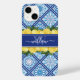 Élégant citrons et carrelage bleu méditerranéen étui téléphonique monogramme. citrons d'aquarelle unique et tendance, feuilles verdoyants sur un arrière - plan de tuiles bleues avec un modèle monogramme personnalisé et élégant nom de script de calligraphie modèle. Cette jolie couverture de téléphone botanique vert, jaune, bleu et blanc ferait un cadeau réfléchi pour maman, fille, grand-mère, etc.