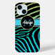 Ce coque zèbre noir moderne et chic rayé iPhone 15 a un dégradé de couleur arrière - plan du jaune au vert au turquoise avec une bande turquoise, noir et blanc au milieu avec un cercle noir et vert sur le dessus qui a du texte modèle pour vous de personnaliser avec votre nom en blanc sur votre monogramme ou initial en turquoise. C'est parfait pour la jeune femme amoureuse de plaisir avec un style tout seul. Si vous avez besoin d'aide, envoyez un courriel à niteowlstudio@gmail.com.