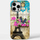 Tour Eiffel Paris France Aesthétique française avec tôle d'antiquité Revêtue d'une texturé dévêtue Faux rustique Parchemin Arrière - plan Paris tendance La Ville la plus romantique avec quelques tourterelles accrochées à un arbre fleuri aux élégants coques iphone d'arbres de fleurs roses. Les fleurs roses sont si romantiques à Paris au printemps. Les oiseaux de l'amour qui pendent sous la Tour Eiffel à côté de la Belle Seine. En haut avec votre Monogramme accroché à un élément floral abstrait moderne bleu aqua bleu turquoise.