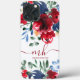 Coque monogramme rustique bleu rouge élégant à couleur florale avec de jolies pivoines rouges peintes, fleurs bleu marine, feuilles verts et bouquet.