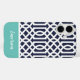 Élégant étui de téléphone personnalisé en bleu marine, bleu turquoise et blanc. Ce design présente un motif de treillis marocain préppant. Personnalisez-le avec votre nom ou autre texte personnalisé dans une police monogramme de script moderne. Utilisez les outils de conception pour choisir les couleurs arrière - plans, modifier les polices de texte et les couleurs et télécharger vos propres photos pour créer une couverture unique d'un appareil unique!