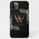 Elégante aquarelle verdure feuille monogramme de nom étui de téléphone avec un monogramme d'or initial sur un arrière - plan noir chic. Conçu par Thisisnotme©