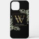 Elégante aquarelle verdure feuille monogramme de nom étui de téléphone avec un monogramme d'or initial sur un arrière - plan noir chic. Conçu par Thisisnotme©