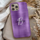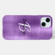 Cette coque de téléphone personnalisée élégante présente un monogramme et un prénom en écriture moderne noire et blanche sur un fond tendance en métal brossé violet.