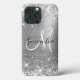 Faux parties scintillant argent brillant avec étincelles contre une fausse image graphique en métal brossé à l'ombre gris argenté. Le monogramme présente un élégant combo de calligraphie noir et blanc. Customisez les styles de police pour créer votre propre équipement téléphonique. Les couleurs principales de ce design girly sont argent, gris, noir et blanc.