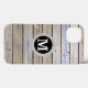 Étui de téléphone à monogramme en bois rustique. Vous allez adorer ce look tendance rustique et moderne ! Lettre de monogramme blanche dans des cercles noirs et gris et un fond de lattes de bois.