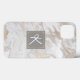 Coque iphone élégant fait dans un motif marbré blanc, gris et or. Une zone de texte carré gris et or, au milieu du coque, a un seul monogramme de script blanc. Personnalisez le monogramme d'une lettre, pour vous-même ou comme une excellente idée cadeau pour elle.