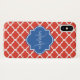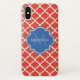 Un motif Quatrefoil Marocain orange-rouge tendance à peine Il y a un Coque iPhone X avec un badge bleu que vous pouvez personnaliser en ajoutant votre nom et monogramme initial à. Il fait partie de la collection Cherry Tomato and Palace Blue Spring Quatrefoil Collection