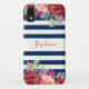 Ce capot téléphonique est doté de rayures bleu marine avec aquarelle bordeaux et roses de pêche et de fleurs avec feuillage. Personnalisez-le avec un nom.