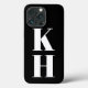 monogramme minimaliste personnalisé initiales verticales personnalisées, lettres coque iphone noir et blanc. Style moderne élégant personnalisable texte de police serif blanc, noir arrière - plan uni.