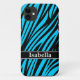 Motif d'impression zèbre turquoise bleu et noir, mignon et tendance, avec nom personnalisé. Ajoutez votre touche personnelle lorsque vous customisez votre nom complet ou vos initiales monographiques sur la plaque signalétique en noir et blanc. Cool cadeau personnalisé pour les filles et les femmes qui aiment les posters de animaux de jungle dans des couleurs amusantes funky.