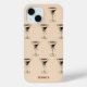 Étui iPhone marron personnalisé avec motif chic d'espresso et nœud présente un fond marron sophistiqué orné d'un motif délicat en ligne-art de verres à espresso martini avec des nœuds élégants sur les tiges. Un nom marron personnalisé se trouve en bas, ajoutant une touche unique et élégante.