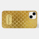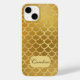 Ce boîtier téléphonique glamour a une échelle de poisson exotique arrière - plan dans les tons or, avec les écailles étant fausse parties scintillant or. Votre nom est écrit en écriture en or brun au centre d'une bannière d'or pâle, également doublée en parties scintillant d'or faux. Joli !