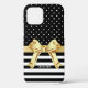 Coque iphone design, avec un motif à pois noir et blanc, en haut de la coque et un arrière - plan rayé noir et blanc, en bas. Des graphiques d'un joli ruban et d'un arc de couleur or traversent le coque entre les deux arrière - plans. Le texte personnalisé blanc, en bas, est prêt à être personnalisé. Joli moyen de protéger votre appareil et d'avoir l'air élégant aussi, et fait une excellente idée cadeau personnalisée. Choisissez une finition mate ou brillante sur ce coque à l'allure superbe.