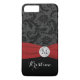 La caisse florale noire et grise moderne décorée d'un monogramme de l'iPhone 7 de Coque-Compagnon de motif de damassé avec le rouge A IMPRIMÉ le ruban et A IMPRIMÉ la broche de cristal de regard gravée par faux. Customisez-la pour ajouter votre nommé, l'initiale, ou tout autre texte. Si vous avez besoin d'aide, envoyez niteowlstudio@gmail.com.