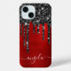 Faux parties scintillant noire brillante goutte sur du papier métallique brossé rouge. La signature girly moderne dispose d'une élégante police de calligraphie blanche avec queues décoratives. Customisez les styles de police pour créer votre propre équipement téléphonique. Un joli cadeau de remerciement pour une demoiselle d'honneur à votre mariage.