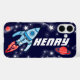 coque iphone de fusée spatiale bleu foncé cool. Personnalisez avec le nom de votre enfant jusqu'à 5 lettres. Cet exemple montre Henry. Design exclusif et illustration graphique par Sarah Trett pour www.mylittleeden.com