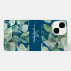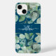Élégant Étui Téléphonique Monogrammé Feuille Eucalyptus. Une aquarelle unique et branchée de verdure eucalyptus sur un arrière - plan bleu avec un modèle monogramme personnalisé et élégant nom de script de calligraphie modèle. Cette jolie couverture de téléphone botanique verte, bleue et blanche ferait un cadeau réfléchi pour maman, fille, grand-mère, etc.