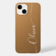 Brown Shimmer White Elegant Calligraphy Script Personnalisé Nom iPhone 14 Smart Phone Boîtes dispose d'un design moderne et tendance simple et élégant avec votre nom personnalisé dans élégante calligraphie manuscrite typographie sur un arrière - plan brillant brun métallique. Conçu par ©Evco Studio www.zazzle.com/store/evcostudio