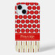 Des boules de cricket créent un motif de pois brillant sur un arrière - plan blanc sur cette étagère de téléphone sportif. Les chauves-souris de cricket sont également utilisées dans un motif complémentaire. Une bande rouge à travers le coque a de l'espace pour ajouter un nom ou un autre texte à personnaliser.