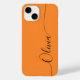 Orange Black Elegant Calligraphy Script Personnalisé Nom iPhone 14 Smart Phone Boîtes dispose d'un design moderne et tendance simple et élégant avec votre nom personnalisé dans élégante calligraphie manuscrite typographie de script sur un arrière - plan orange. Conçu par ©Evco Studio www.zazzle.com/store/evcostudio