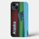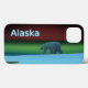 Un ours polaire arpente la glace pendant la longue nuit polaire; les aurores boréales en rouge et vert au loin. Le texte "Alaska" en bleu et blanc brillant apparaît également.